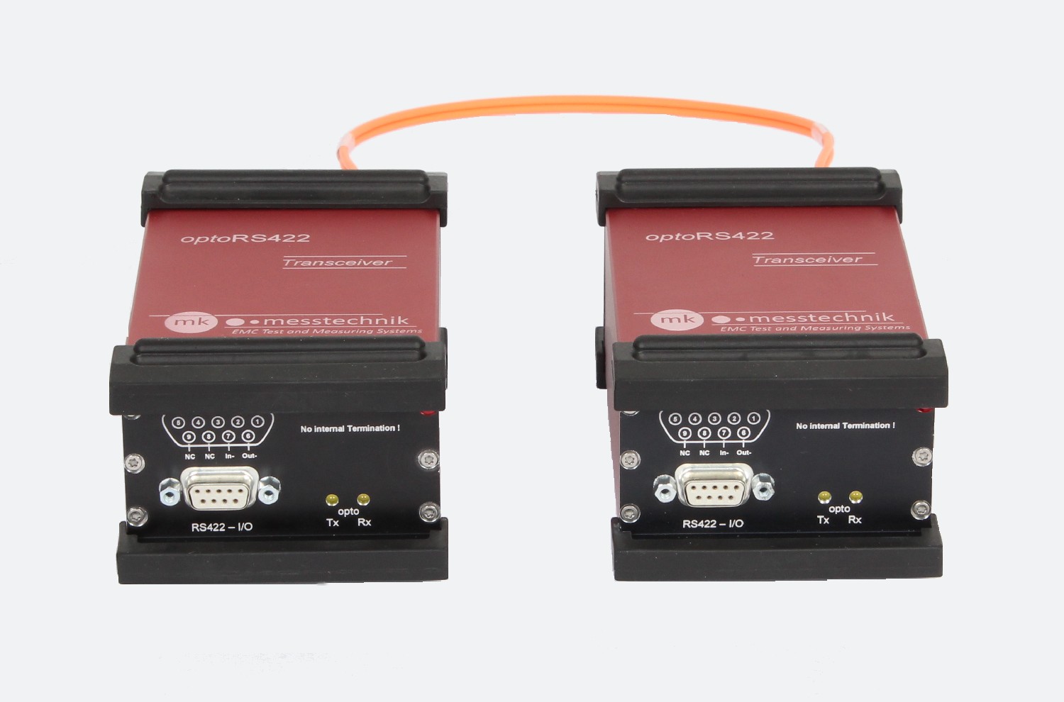 Das optoRS422 System kann zur bidirektionalen optischen Übertragung von RS422-Signalen. Die maximale Datenrate beträgt standardmäßig 1 MBit/s.Höhere Datenraten sind auf Anfrage ebenfalls möglich. Im Gegensatz zu RS485 werden bei RS422 Rx und Tx auf getrennten Leitungen übertragen, wodurch ein einfacher Voll-Duplex-Betrieb möglich ist.